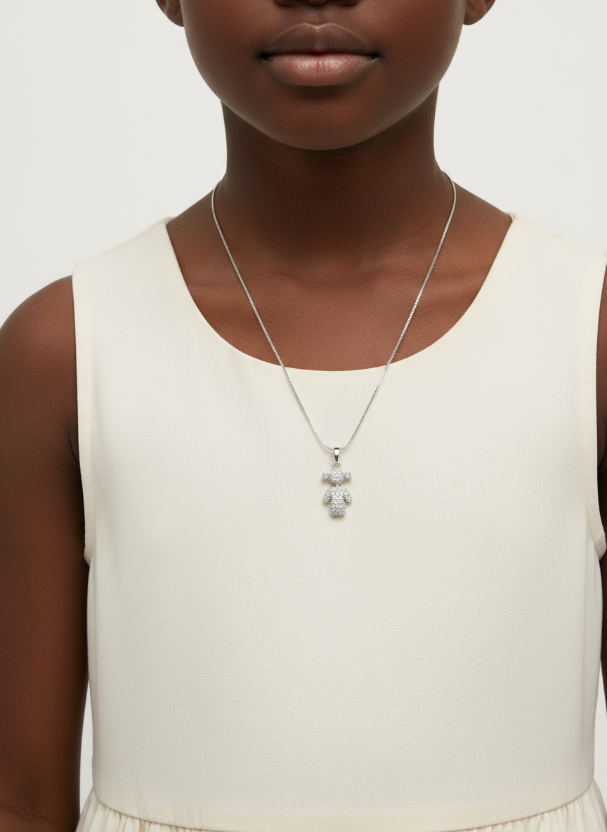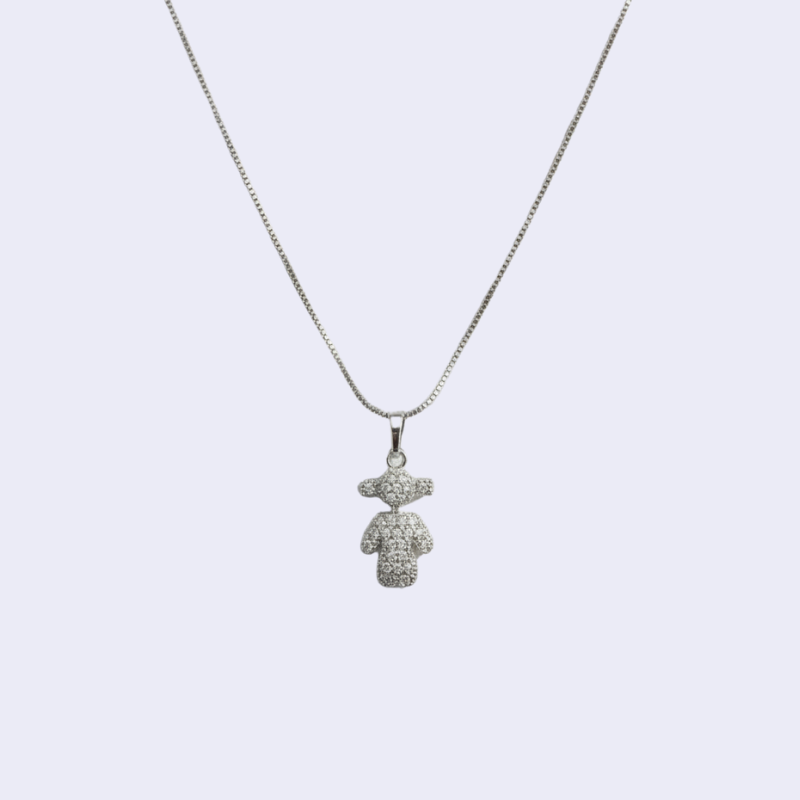 COLLIER ENFANT FILLETTE POUPEE ZIRCONS PLAQUE OR GRIS